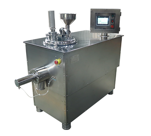 本機(jī)用于制藥工業(yè)中的固體制劑生產(chǎn),集傳統(tǒng)制粒工藝中的混合和制粒兩道工序與一體同時(shí)進(jìn)行,其制粒過(guò)程是先把粉料投入料筒內(nèi)經(jīng)攪拌漿形成翻滾狀態(tài),使不同性質(zhì)的粉料得到徹底的混合,然后逐量加入粘合劑。(通過(guò)攪拌漿和筒壁對(duì)物料的擠壓、揉合,使其形成潮濕均勻的軟材,同時(shí)經(jīng)制粒刀片的高速切割,逐步形成大小均勻的顆粒,最后由出料口排出,顆粒目數(shù)的大小由制粒刀的轉(zhuǎn)速和制粒時(shí)間控制)。